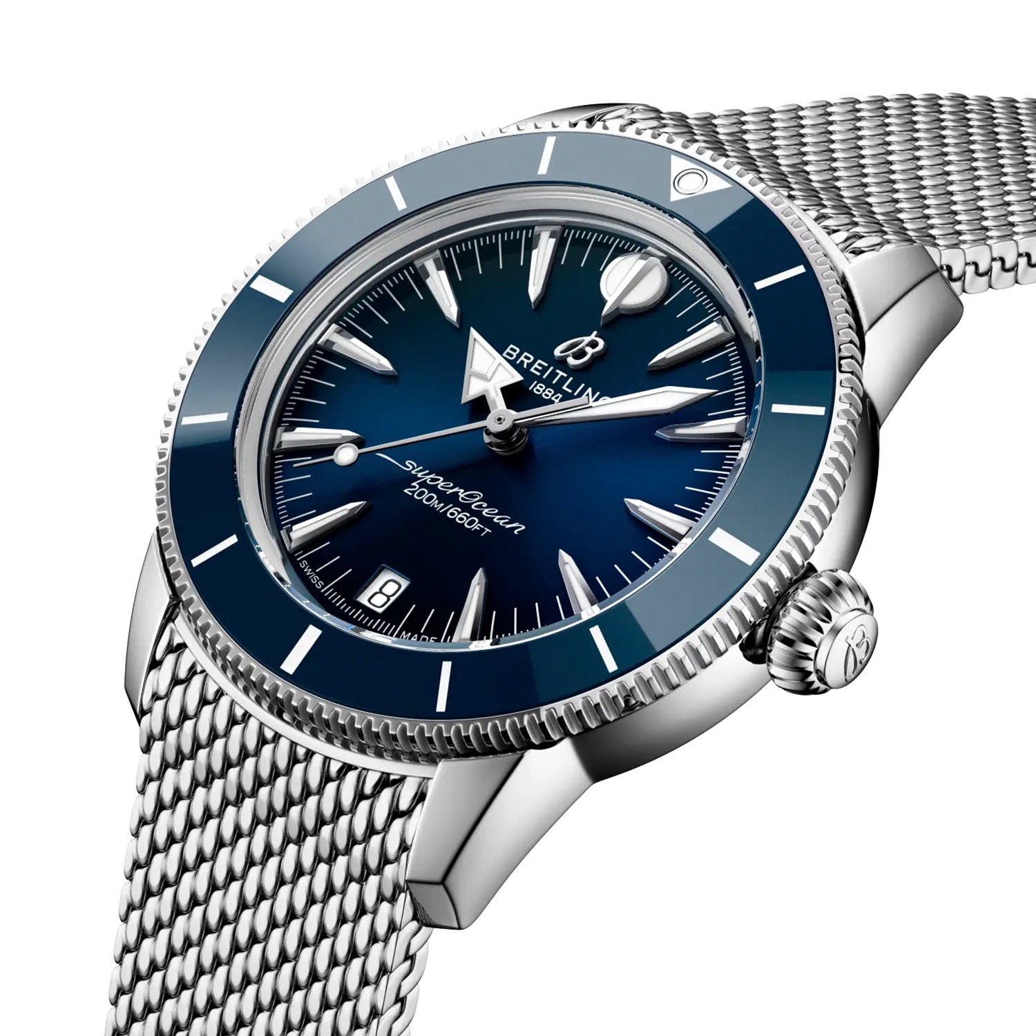 Breitling equips this model with the self-winding Breitling Caliber 10, delivering reliable precision at 28,800 vibrations per hour and a power reserve of approximately 42 hours. A discreet date aperture adds practical functionality without disrupting the dial’s clean, vintage-inspired design. The cambered sapphire crystal, glareproofed on both sides, provides outstanding clarity in all lighting conditions, whether above or below the surface.