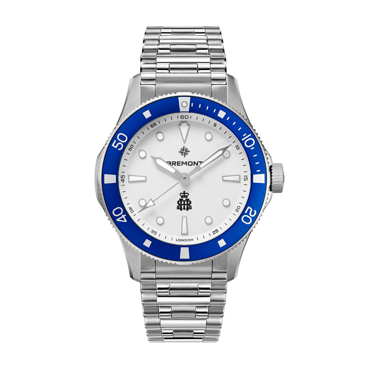 The crisp matte white dial features polished nickel-plated hands and applied indexes filled with luminous material that emits a brilliant blue glow, ensuring outstanding legibility in all lighting conditions. At 6 o’clock, the Henley Royal Regatta crest is displayed with pride, complemented by a vibrant blue anodised aluminium bi-directional bezel — a nod to the Regatta’s signature colors.