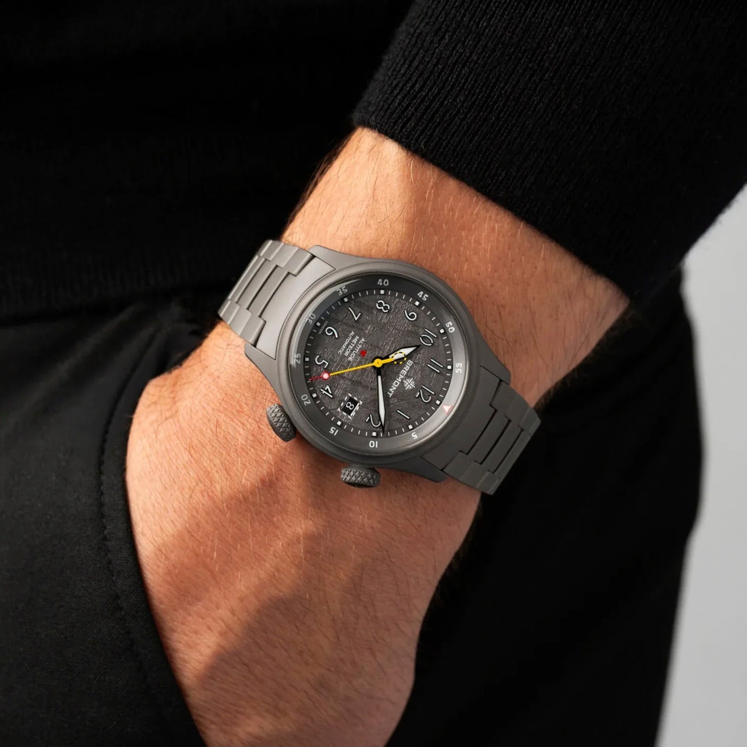 Its meteorite-embossed dial, inspired by the texture of an actual meteorite, adds depth and individuality to the watch. Applied numerals and indexes, filled with high-contrast white Super-LumiNova® with blue emission, ensure optimal readability in any light. The yellow “ejection” seconds hand—a nod to cockpit safety markings—pays homage to Bremont’s exclusive MBI heritage.