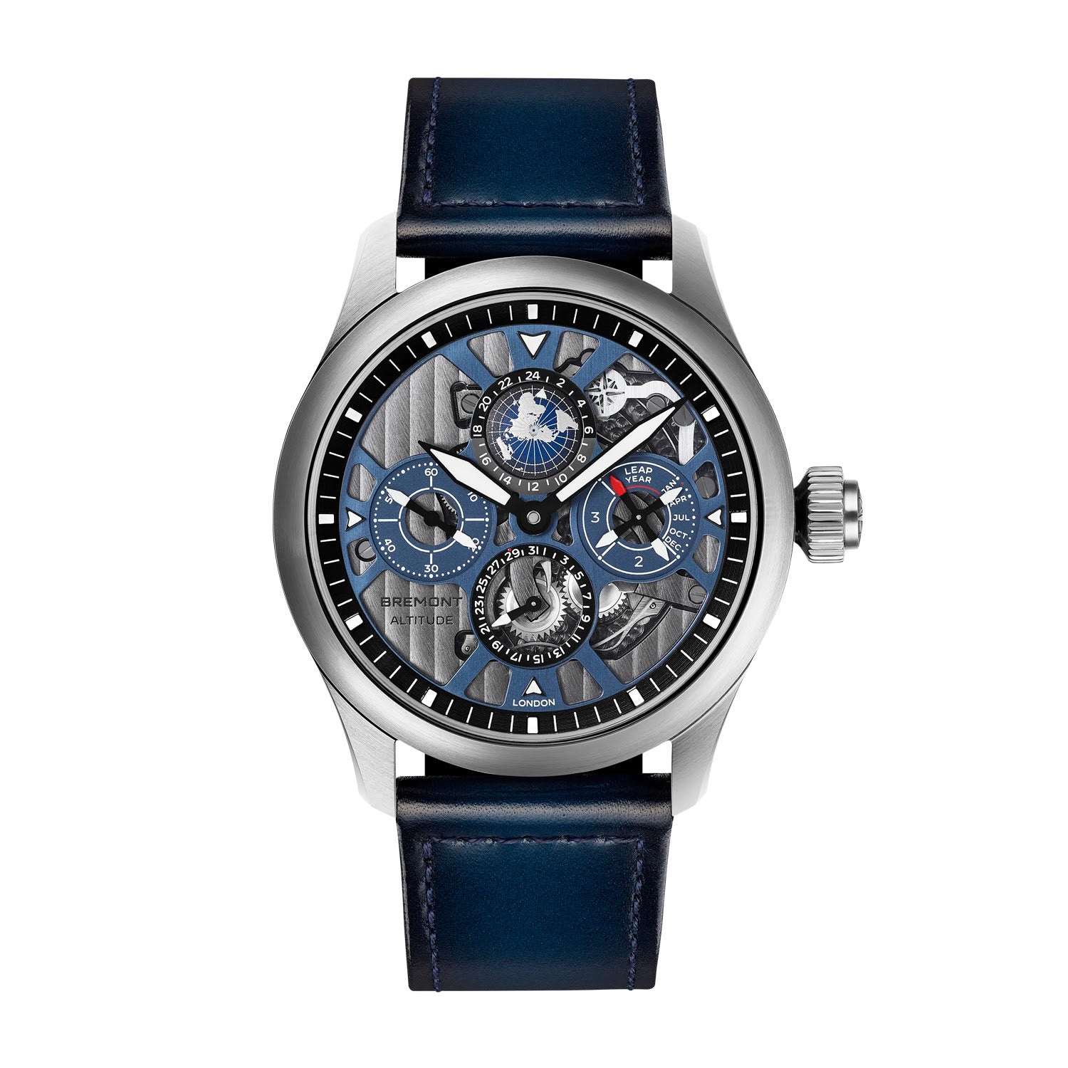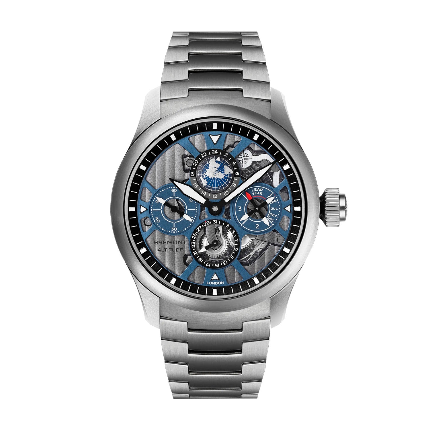 The BREMONT Altitude Skeletonised Perpetual Calendar GMT represents the pinnacle of the Altitude Collection—an extraordinary fusion of haute horology and aviation-inspired design, limited to just 50 pieces worldwide. Crafted in a lightweight 42mm Grade 2 titanium Trip-Tick® case, this rare timepiece features a brushed Air Force Blue skeleton dial that showcases the full architecture of its Agenhor-developed perpetual calendar and GMT mechanisms. The open-worked design reveals bridges, finishing, and intricate mechanical interplay, reinforced by structural blue arms that maintain rigidity while enhancing clarity across its beautifully arranged subdials.