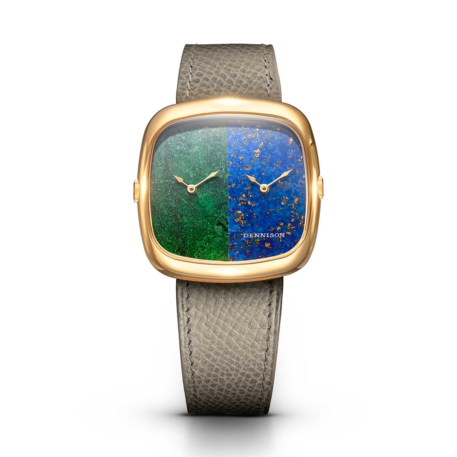 Dennison presents the ALD Dual Time Bloodstone & Lapis, a striking fusion of color, texture, and craftsmanship housed within a refined gold-tone case. This distinctive model showcases a split natural-stone dial, pairing the deep, earthy richness of green Bloodstone with the vivid, electric blue of Lapis. Each stone features its own natural inclusions, giving every watch a unique character while creating a beautifully balanced contrast between the two time zones. The result is a design that is both visually captivating and effortlessly functional—allowing you to distinguish time zones at a glance while wearing a true work of art on the wrist.