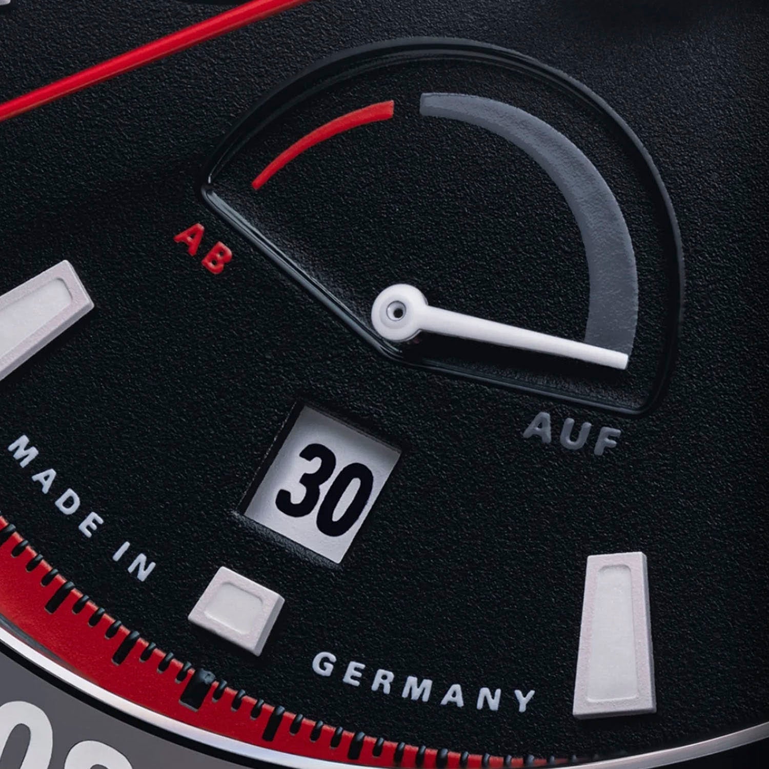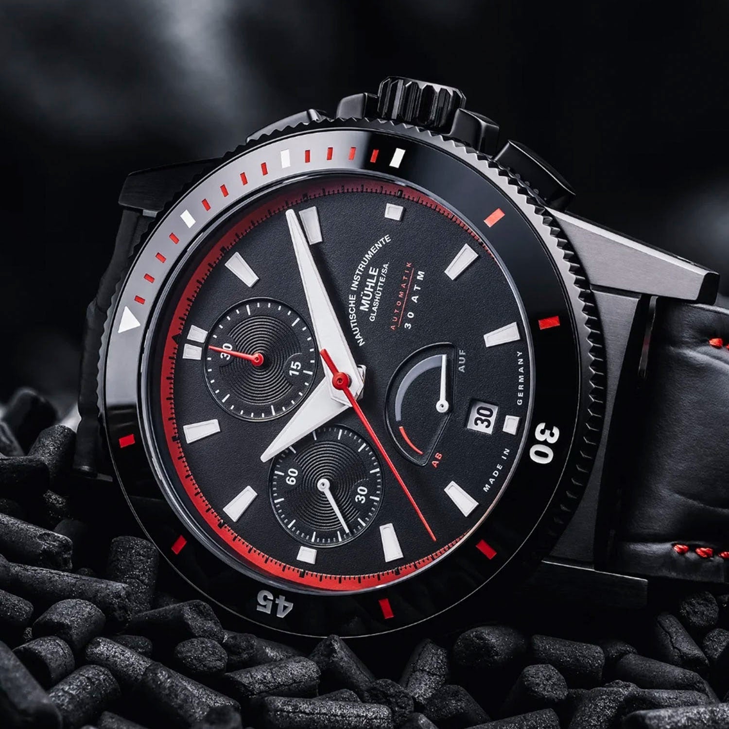 Inside, the automatic MU9424-GR movement showcases Muhle’s woodpecker neck regulation, stop-second function, quick date correction, and an impressive 62-hour power reserve. The Up/Down display at 6 o’clock makes power management intuitive, while the central chronograph hand and 30-minute counter at 12 o’clock allow precise timing to one-eighth of a second. Applied indices, a rich black dial, and Super-LumiNova coatings ensure excellent readability in any environment.