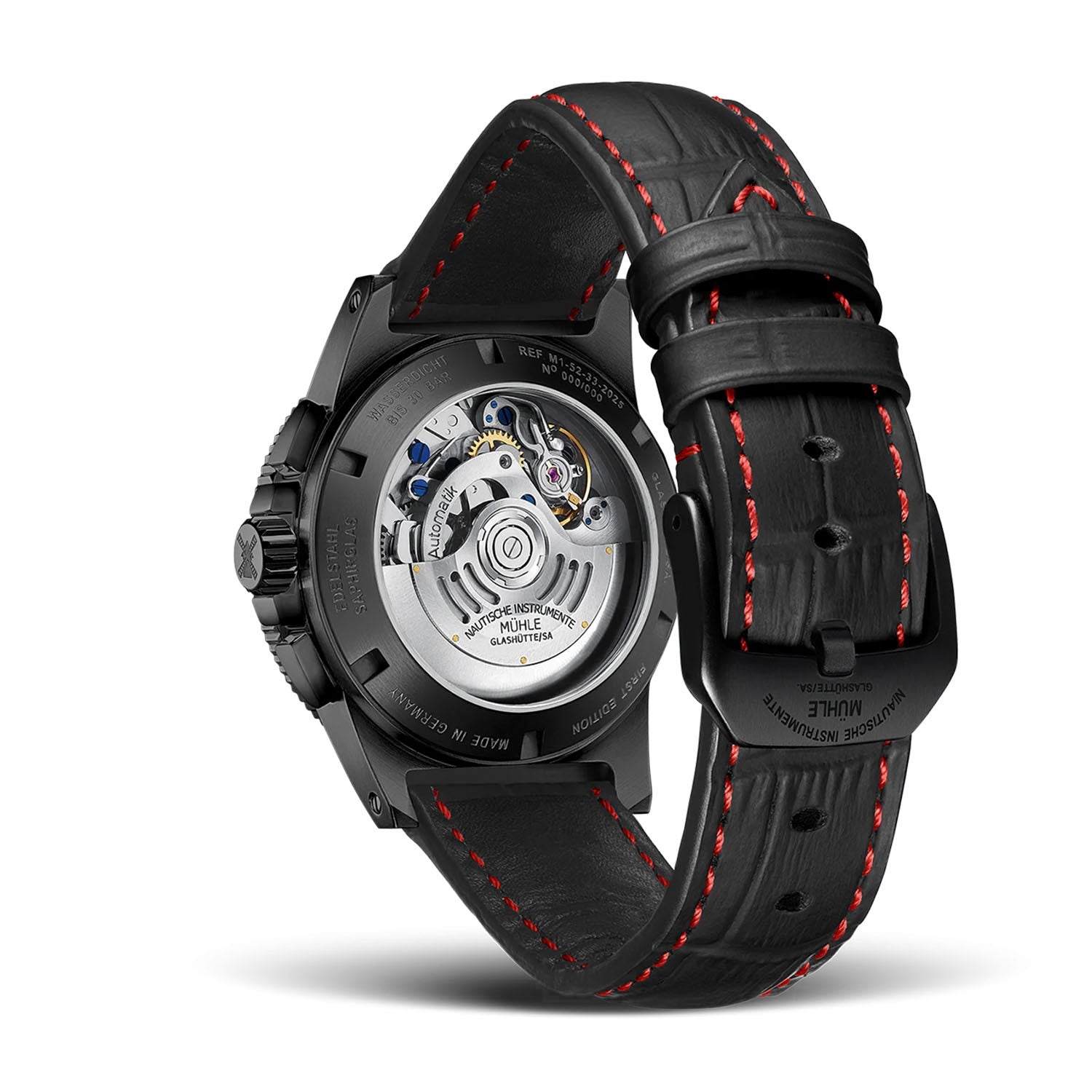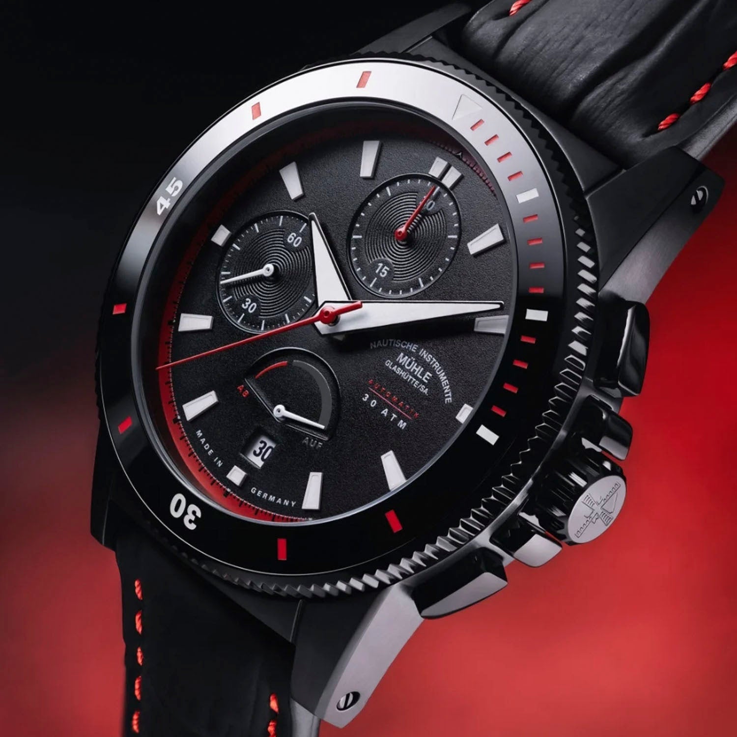 Muhle introduces the Sportivo Power Chronograph First Edition, a bold and dynamic timepiece limited to just 200 pieces. Designed for those who meet every challenge with strength and precision, this chronograph embodies Muhle’s commitment to performance, clarity, and resilience. Its striking black-and-red aesthetic pairs with the powerful MU9424-GR modular movement, delivering exceptional functionality for both professional demands and athletic pursuits. The 42.5mm stainless-steel case features a robust black IP coating, a scratch-resistant ceramic bezel, a double anti-reflective sapphire crystal, and a screw-down crown—ensuring durability and an impressive 300 meters of water resistance.