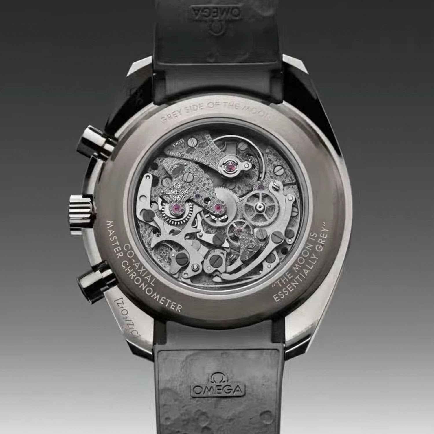 At its heart beats the OMEGA Co-Axial Master Chronometer Caliber 3869, a manual-winding movement certified by METAS for accuracy, magnetic resistance up to 15,000 gauss, and reliability under any condition. Laser-ablated engravings on the main plate and bridges depict the moon’s texture, while the caseback bears Jim Lovell’s iconic words from Apollo 8: “The Moon is essentially grey.”
