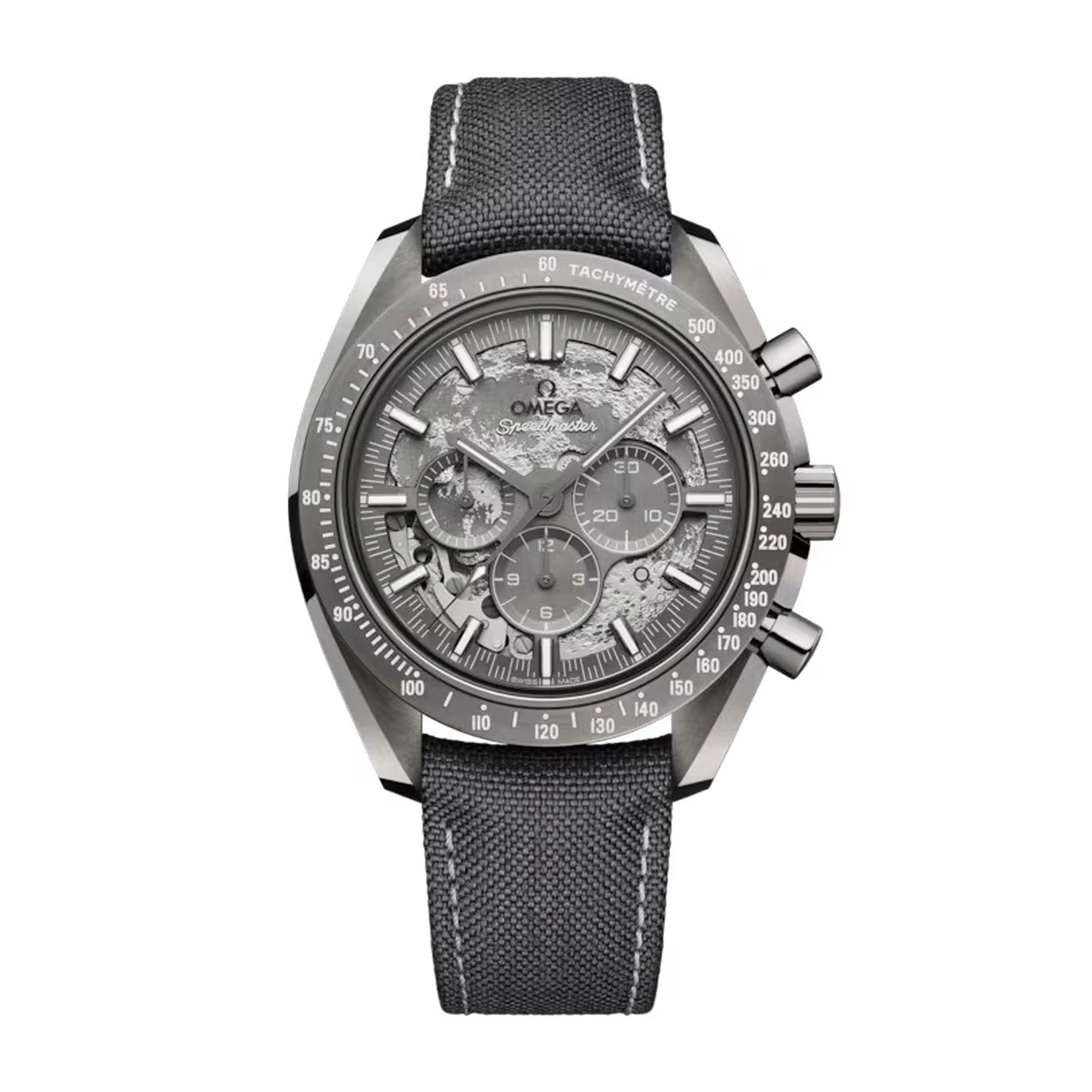 The OMEGA Speedmaster Dark Side of the Moon “Grey Side of the Moon” (Ref. 310.92.44.50.06.001) pays tribute to OMEGA’s legendary connection to space exploration with a striking design that blends innovation and artistry. Crafted from polished and brushed grey ceramic with a unique plasma treatment, the 44.25 mm case exudes a sleek, modern elegance. The brushed ceramic bezel features a laser-engraved tachymeter scale filled with white Super-LumiNova, adding both style and function.