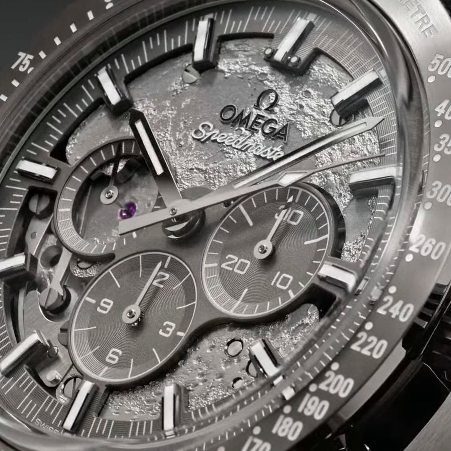Beneath the scratch-resistant sapphire crystal lies a skeletonized grey anodized aluminum dial inspired by the moon’s surface, mirrored beautifully on the movement side through the transparent caseback. Every detail—from the Moonwatch-style hands to the greyed indexes filled with luminous Super-LumiNova—celebrates precision and heritage. The small-seconds display at 9 o’clock, 30-minute recorder at 3 o’clock, and 12-hour recorder at 6 o’clock enhance the chronograph’s refined functionality.