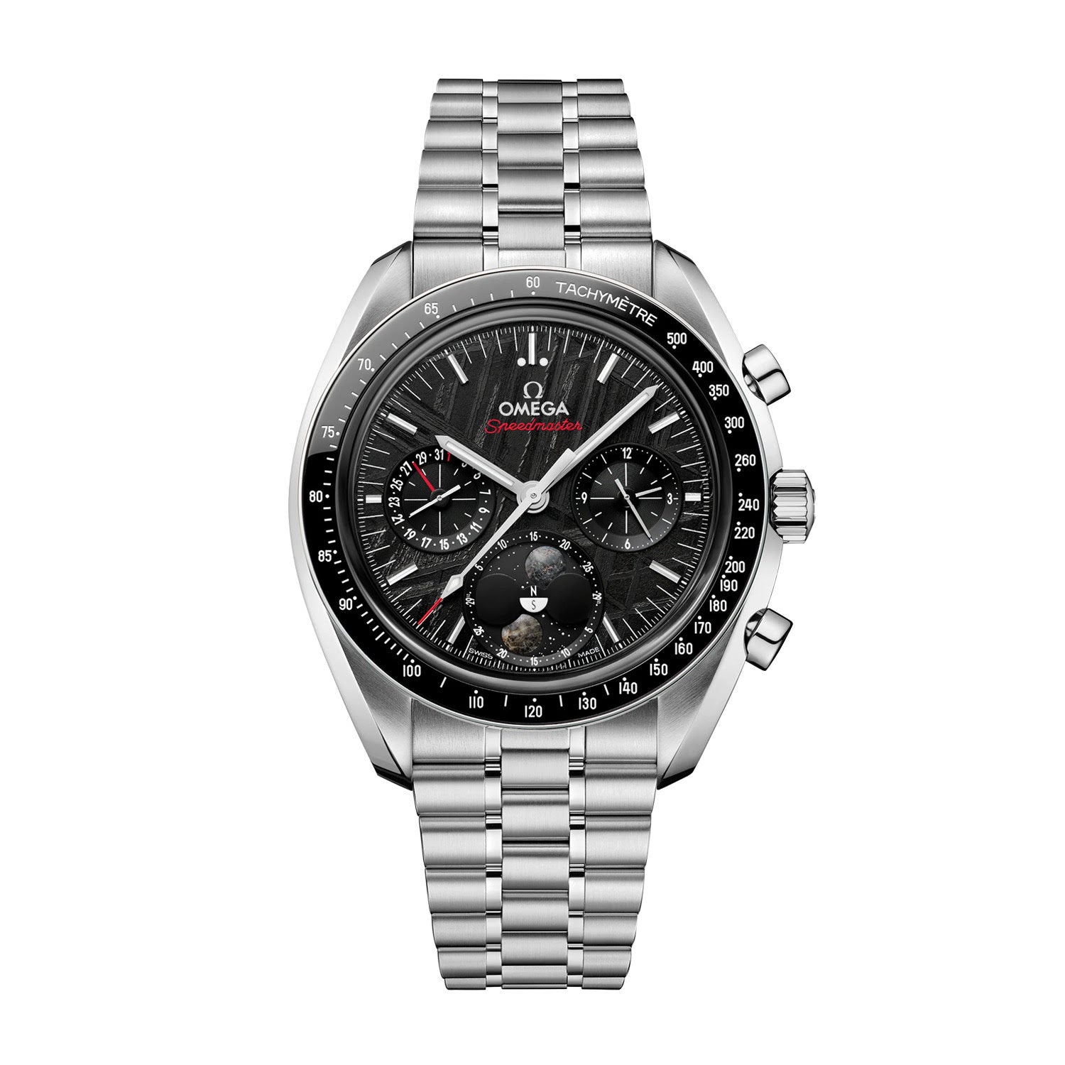 Experience a true celestial marvel with the OMEGA Speedmaster Moonphase, a timepiece that pays homage to OMEGA’s legendary role in all six lunar missions. This 43 mm watch features a breathtaking dial crafted from PVD black-coated meteorite, a rare material of extraterrestrial origin, etched with the distinctive Widmanstätten pattern. Enhancing the cosmic theme, the moonphase display at 6 o’clock showcases two miniature moons crafted from genuine lunar meteorite—one for each hemisphere—shaped, polished, and domed to perfection.