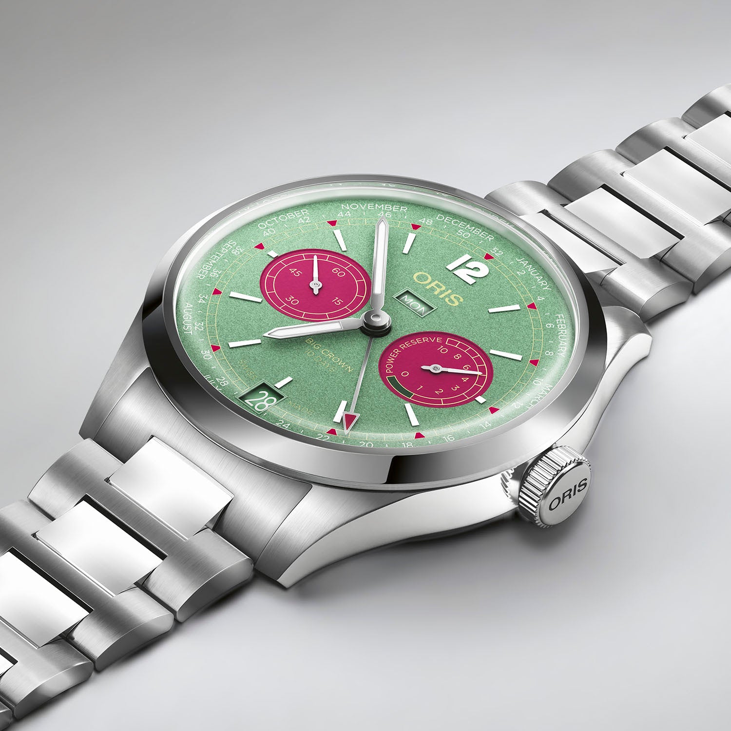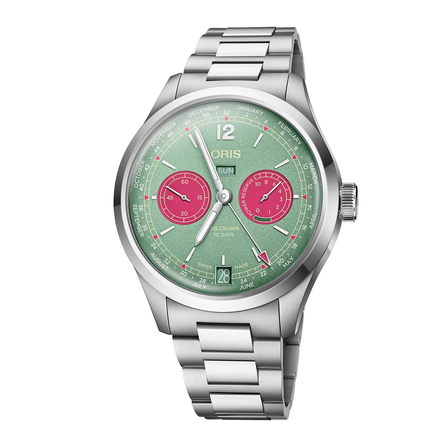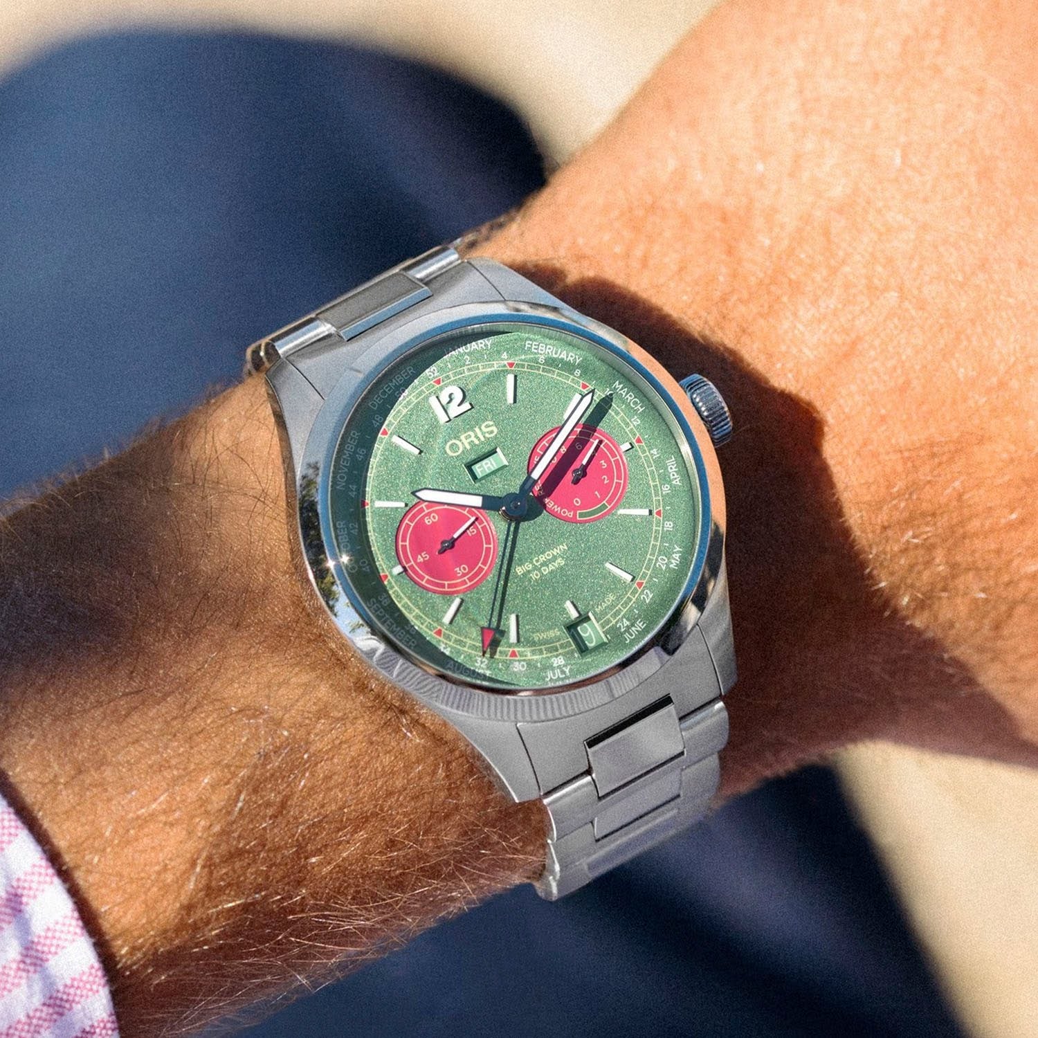 The vibrant green dial radiates warmth and character, reflecting ORIS’s joyful approach to mechanical watch design. At a glance, central hands display hours, minutes, week, and month, complemented by a subsidiary seconds dial at 9 o’clock. Day and date windows, along with intuitive correctors and a fine timing device, ensure both precision and ease of use. The movement operates at 21,600 vibrations per hour and features stop-seconds for accurate time setting, underscoring ORIS’s commitment to reliable performance.