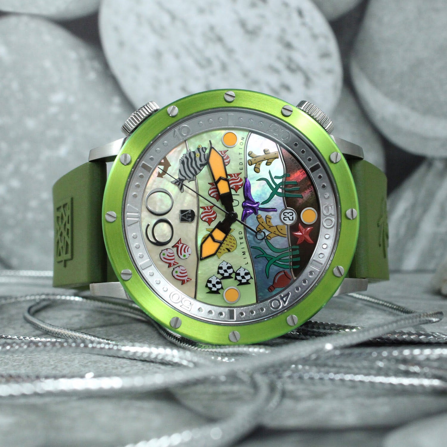 Housed in a 45mm stainless steel case, the watch features a titanium bezel colored via a high-quality anodizing process for perfect harmony with the green rubber strap. Two crowns—one for the rotating inner bezel and one for setting the time—are both clearly marked and double-sealed for water resistance up to 100 meters. Powering the Flensi is a Swiss ETA 2824 or Sellita SW200 automatic movement with a hand-engraved rotor. The case back reveals a delightful 3D engraving of sea turtles.