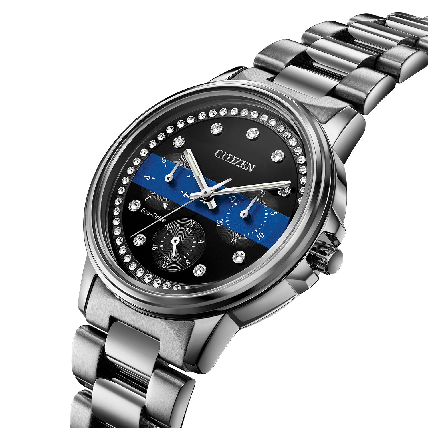 The Citizen Ladies Thin Blue Line™ Crystal Dial Watch is a striking timepiece from the Silhouette Crystal collection, combining elegance with a meaningful tribute to police officers. Its stainless steel construction, both in the case and bracelet, ensures durability, while the black crystal-set dial features the iconic Thin Blue Line passing through it. The luminous silver-tone hands and Swarovski crystal hour markers add a touch of sparkle and sophistication.