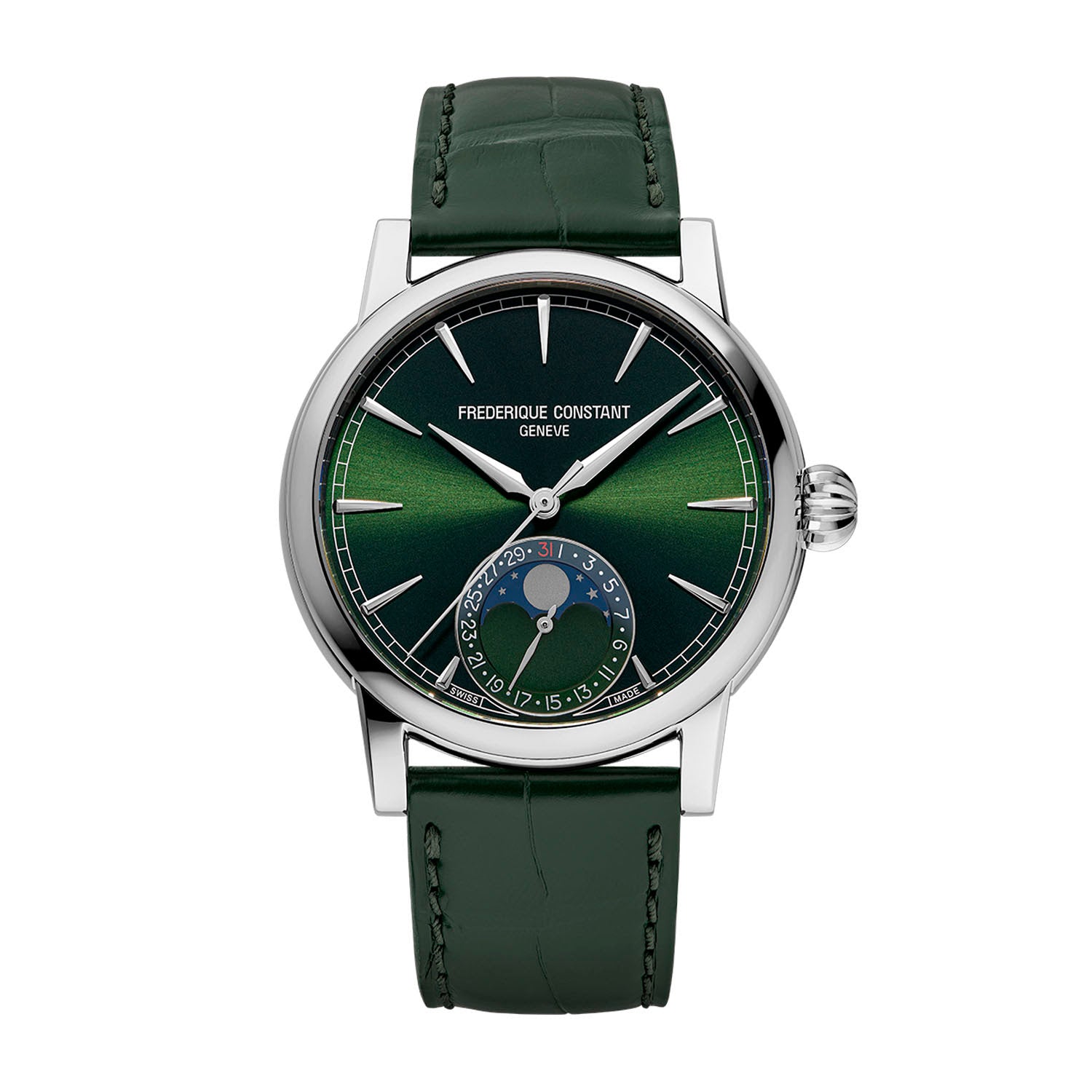 The Frederique Constant Manufacture Classic Moonphase Date is the perfect blend of timeless elegance and modern innovation. Designed for connoisseurs of Geneva’s rich watchmaking heritage, this sophisticated timepiece has been reimagined with a refined design and enhanced functionality. Now featuring a sleek 40mm stainless steel case and a sunburst dial in striking British racing green, it offers an understated yet contemporary aesthetic ideal for everyday wear.
