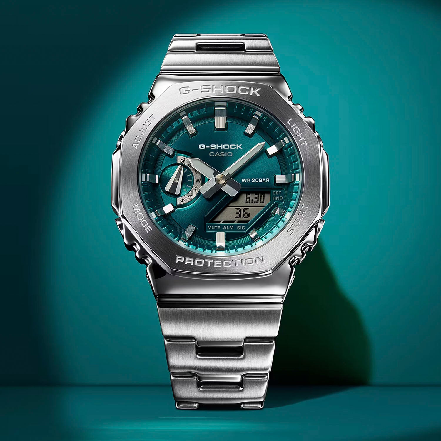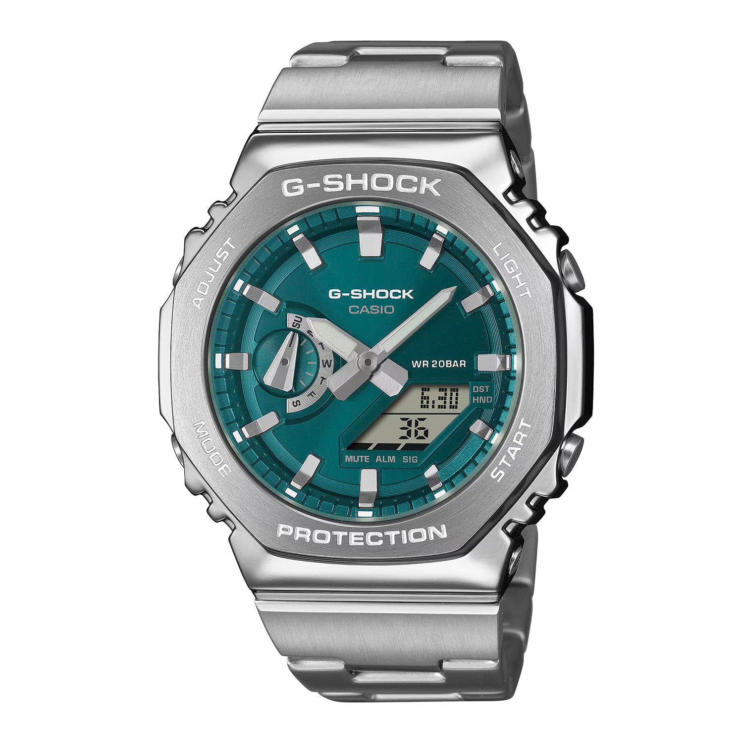 Built on a high-rigidity, glass-fiber-reinforced resin case, this timepiece maintains the shock resistance that defines G-Shock while introducing a sleek metal finish suitable for any setting. The glossy metallic dial in a breezy blue-green tone adds depth and character, complemented by metallic inset rings that enhance its three-dimensional appeal. Paired with a stainless-steel band featuring a clean, refined texture, the GM2110D-3A1 transitions effortlessly from casual wear to professional environments.