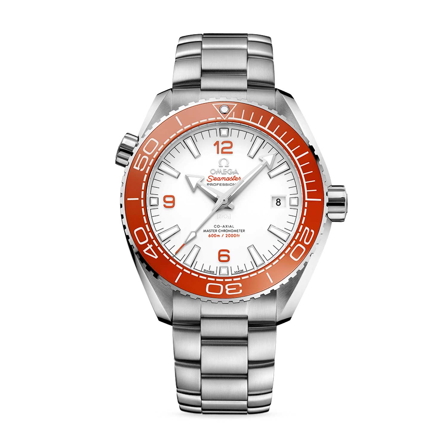 Omega continued to build on its maritime legacy and introduced a professional dive watch, the Seamaster Planet Ocean, in 2005, and has kept it updated with evolving technologies. This model’s stainless steel case is 43.5mm in diameter, 16.1mm thick, and 49mm lug to lug. It is water resistant to 600m, has a screw down crown at 3 o’clock, and a Helium release valve at 10 o’clock. The rhodium-plated broad arrow hands and all 12 raised indices are filled with Super Luminova and the domed sapphire crystal has anti-reflective treatment on both sides for amazing readability. The white dial is made of ceramic and with Arabic numerals at the 6-, 9-, and 12-hour marks, with a color-matched date wheel at the 3-hour mark. The orange ceramic uni-directional bezel has a diving scale filled with liquid ceramic and super-lumiNova. The tip of the seconds hand, the “Seamaster” wordmark, and the depth rating are in orange, adding a bold touch.