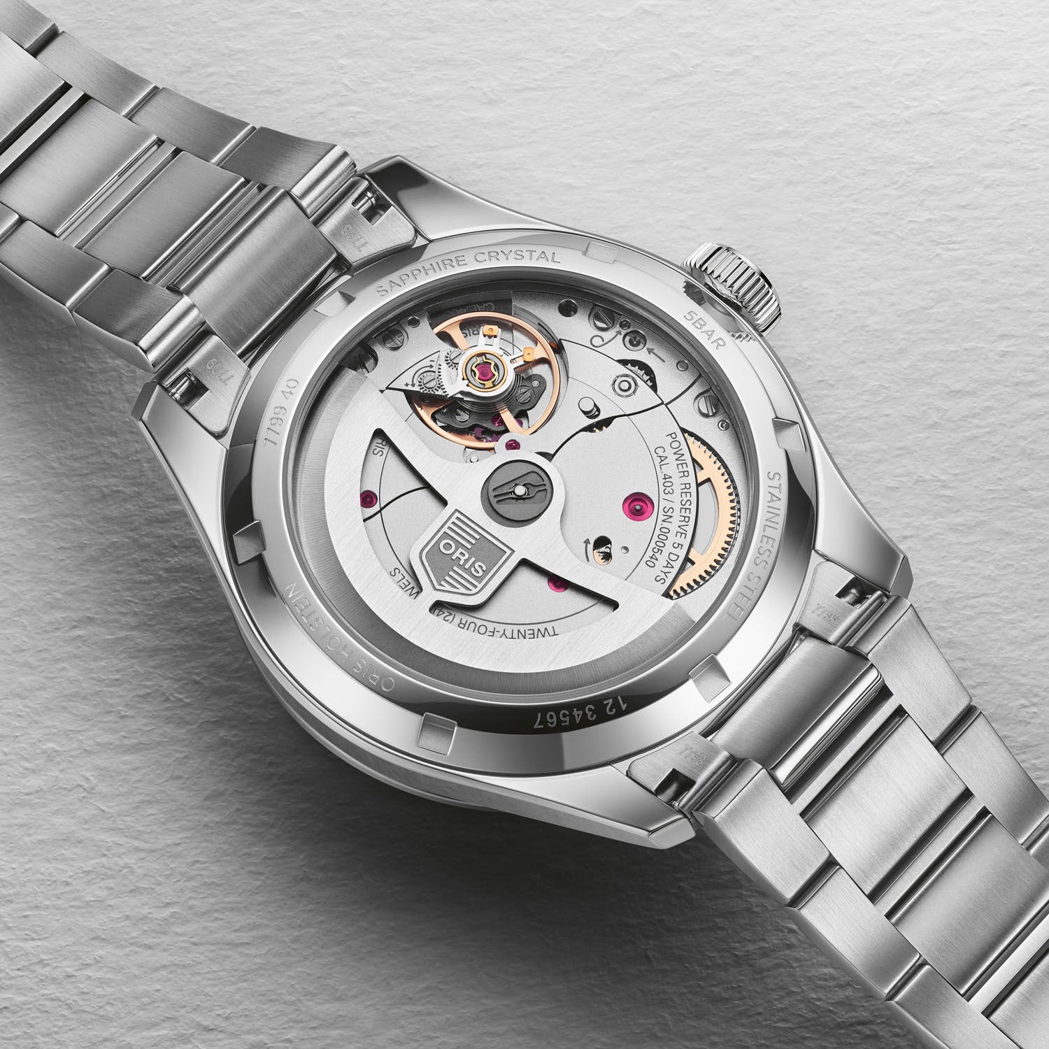 Powered by the in-house ORIS Caliber 403, this watch delivers remarkable precision, maintaining an accuracy of -3/+5 seconds per day, well within COSC tolerances. Its automatic movement boasts a 120-hour power reserve, ensuring reliability even after days off the wrist. A fine timing device, stop-seconds function, and a small seconds subdial at 6 o’clock enhance its technical sophistication. Additionally, the movement is highly antimagnetic, providing superior durability in everyday conditions.